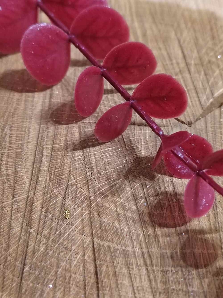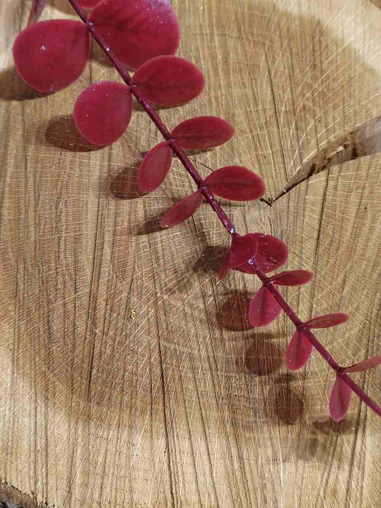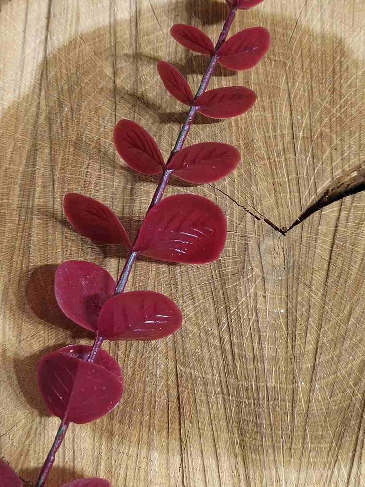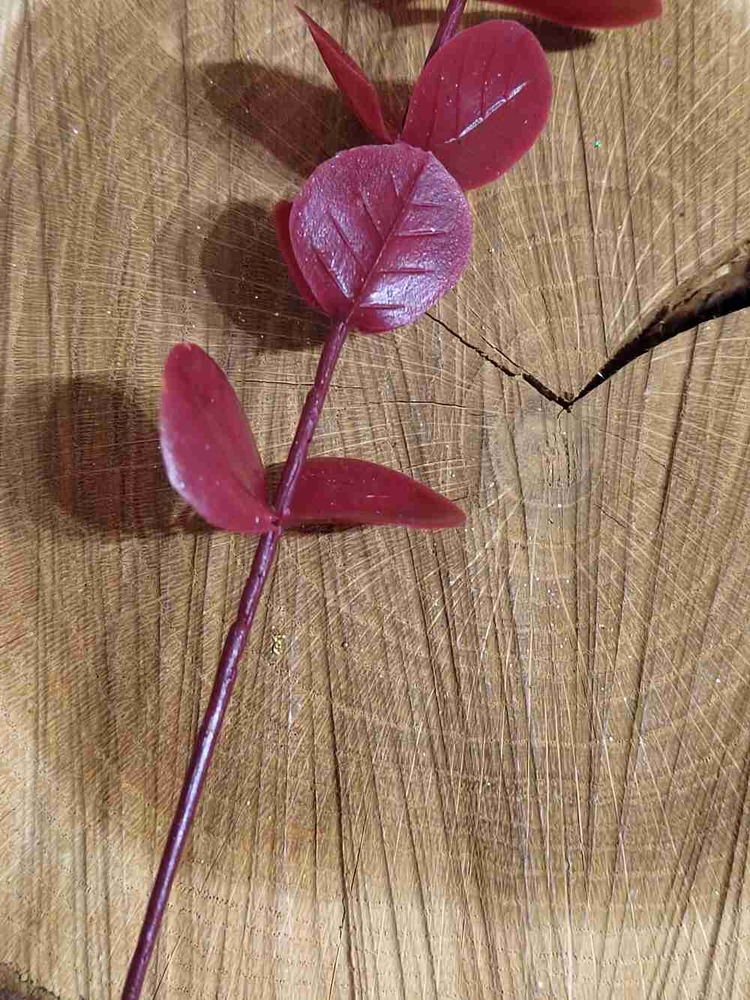Dekorační větvička eukalyptu v bordó barvě na zdobení adventních věnců a vánočních dekorací.